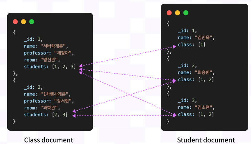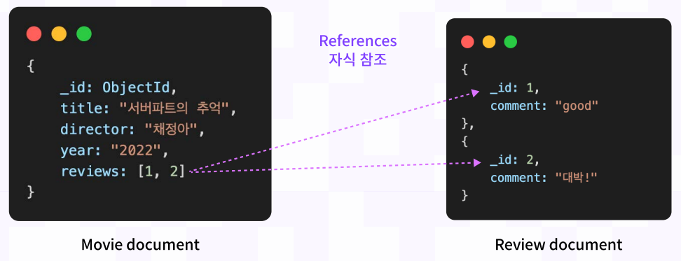 - 관계를 갖는 데이터는 중첩 document, 배열 등을 사용하여 1개의 document로 나타낸다.